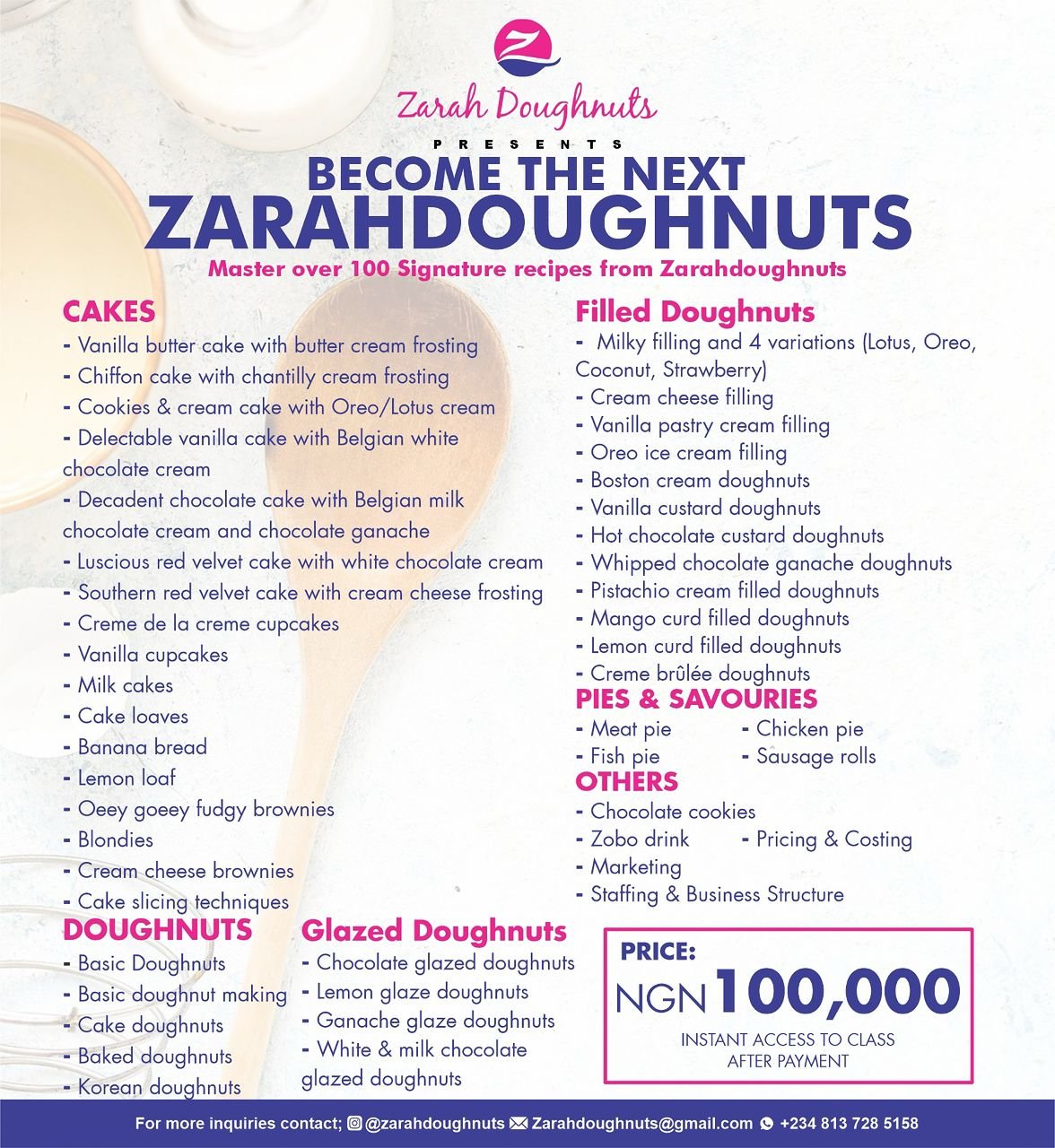Become the Next Zarahdoughnuts is a complete online course where you’ll learn over 100 signature recipes (cakes, doughnuts, pies, and savouries) plus the exact business systems I use to run Zarahdoughnuts profitably. From baking techniques to pricing, marketing, and staff management this course gives you both the skills and the structure to grow from a home baker into a successful bakery brand.