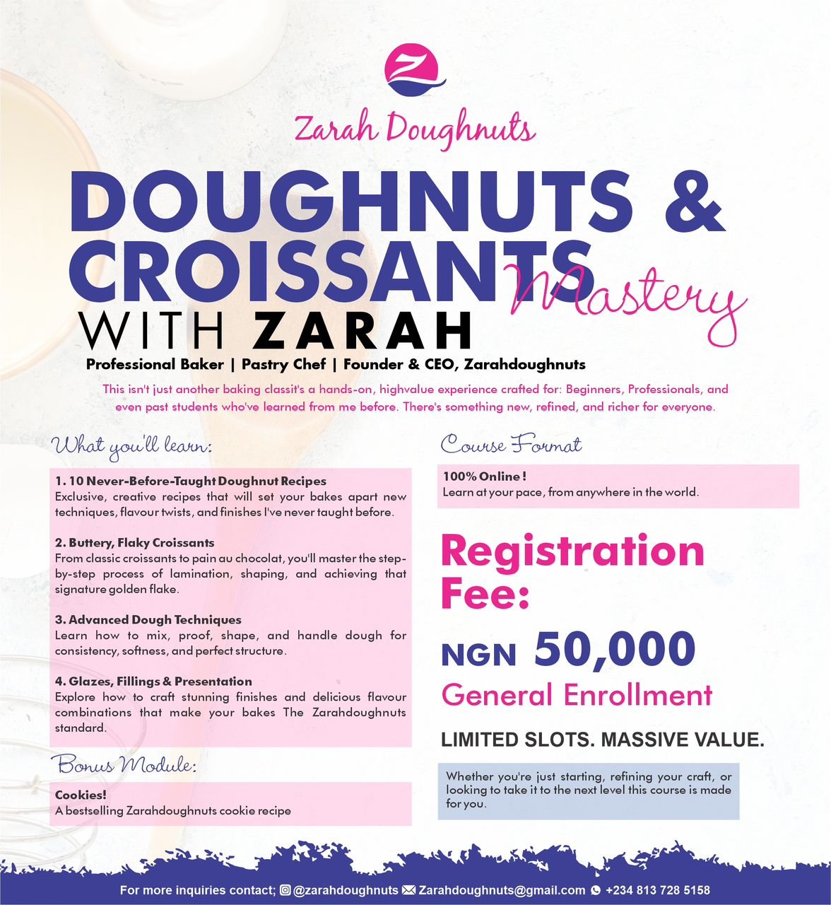 Learn the exact recipes and techniques that built the Zarahdoughnuts empire.